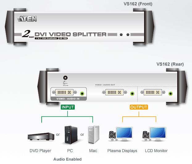 Aten VS-162 2 Port DVI Video Splitter w/ Audio - 1920x1200@60Hz