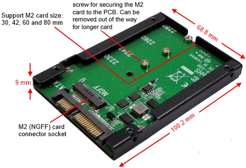 3.Support the 22*30 mm/22*42 mm/22*60 mm/22*80 mm size of M.2 NGFF (SATA) SSD.