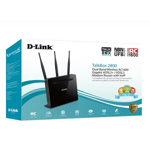 The TalkBox2800 - Dual Band Wireless AC1600 Gigabit ADSL2+ / VDSL2 Modem Router with VoIP (DVA-2800) is a true all-in-one solution. The ADSL/VDSL modem is compatible with all ADSL, VDSL, NBN and UFB connections in Australia and New Zealand and the built-in phone ports allow you to make VoIP phone calls. This device is a highly integrated router with everything your home or small business needs for high-speed Internet access. With Dual Band AC1600 Wi-Fi providing high speed coverage and a full Gigabit Ethernet interface, this modem will connect desktop computers, smartphones, gaming consoles, smart TVs and more throughout your home.