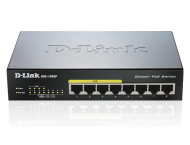 The D-Link 8-Port Gigabit Ethernet PoE Switch (DGS-1008P) enables office