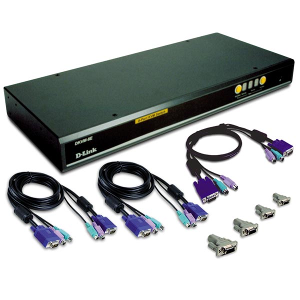 Connect up to 8 CPU's to one Keyboard, Video and Mouse, Up to 8 DKVM-8 can be cascaded supporting 128 CPU's, 19" Rackmount, Supports up to 1920 x 1440 Resolution, Supports VGA, SVGA and Multisync Monitors, Select PC's by On-Screen Display, Push Button or Keyb. "Hot Key", 2 Cable Kits for 2 CPU's Supplied Standard, MUST ORDER ADDITIONAL D-LINK CABLE KIT (DKVM-CB) SHOULD SUPPORT FOR MORE THAN 2 CPU's REQUIRED