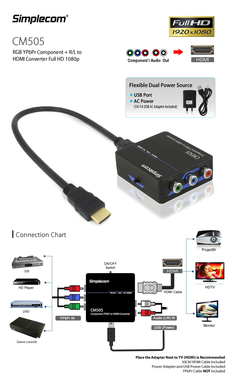 Simplecom CM505 RGB (YPbPr) Component to HDMI converter allows older analog devices to be integrated seamlessly into the modern home theatre. This adapter connects component video home theatre devices to HDMI compliant digital monitors. It also takes digital audio and encodes it onto the HDMI signal for the full HDMI video and audio effect. With the Component+ Digital Audio to HDMI Adapter legacy home theatre devices can be easily connected any HDMI display for the full digital video and audio experience.