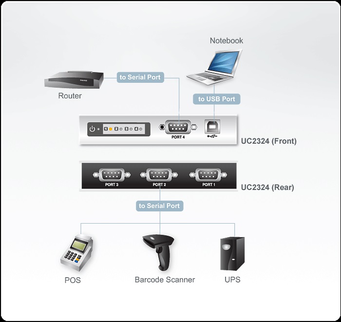 ATEN provides 4 models in this series: 2/4-Port USB-to-Serial RS-232 Hub;2/4-Port USB-to-Serial RS-422/485 Hub.