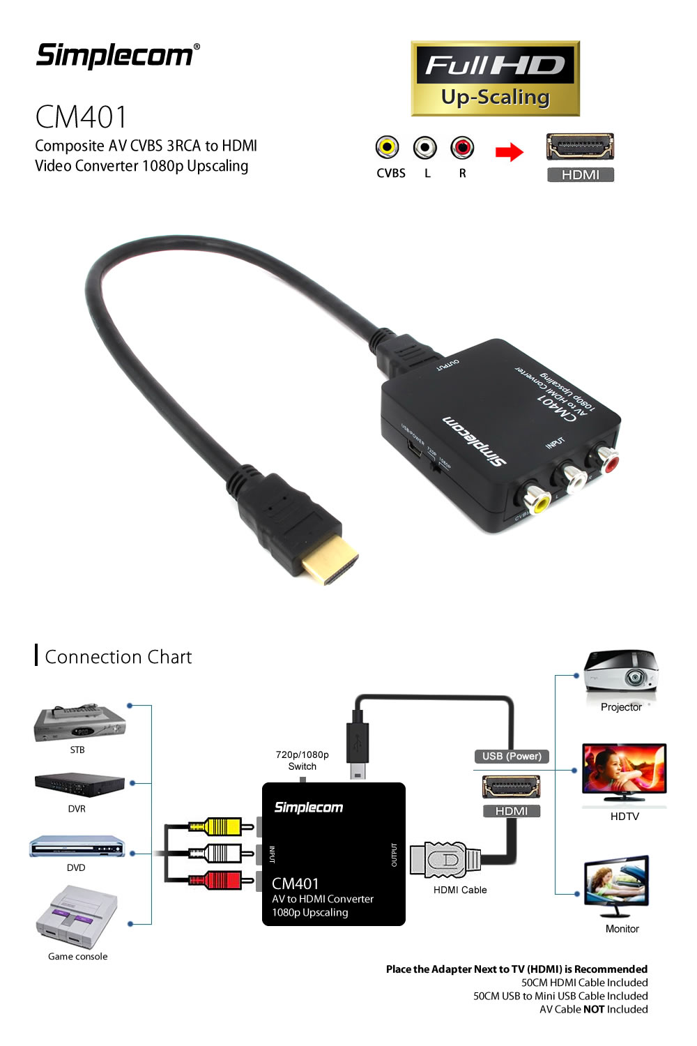 Simplecom CM401 Composite AV CVBS 3RCA to HDMI Video Converter 1080p Upscaling