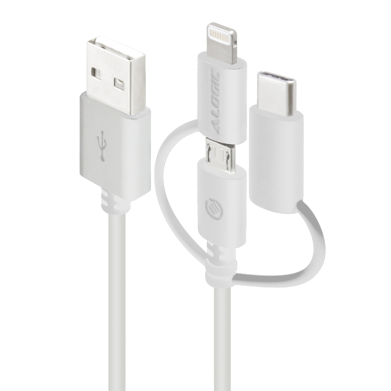 The cable has a standard USB-A connector one one end and the other end is three pronged with Micro USB connector, Lightning connector and USB-C connector. Lightning and USB-C connectors can be saddled on top of Micro USB connector depending on the device being connected to.