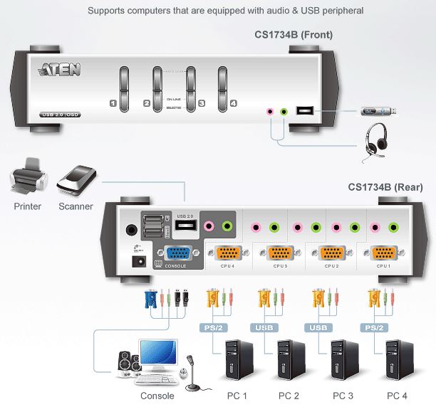 The CS1734B is 4-port KVM switch combined with a 2-port USB 2.0 hub.
